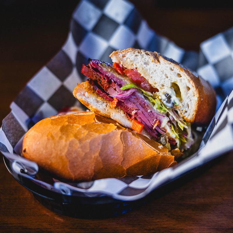 Chopped beef, red onion, pickled peppers American cheese, romaine, tomato. giardiniera mayo on a hero roll.