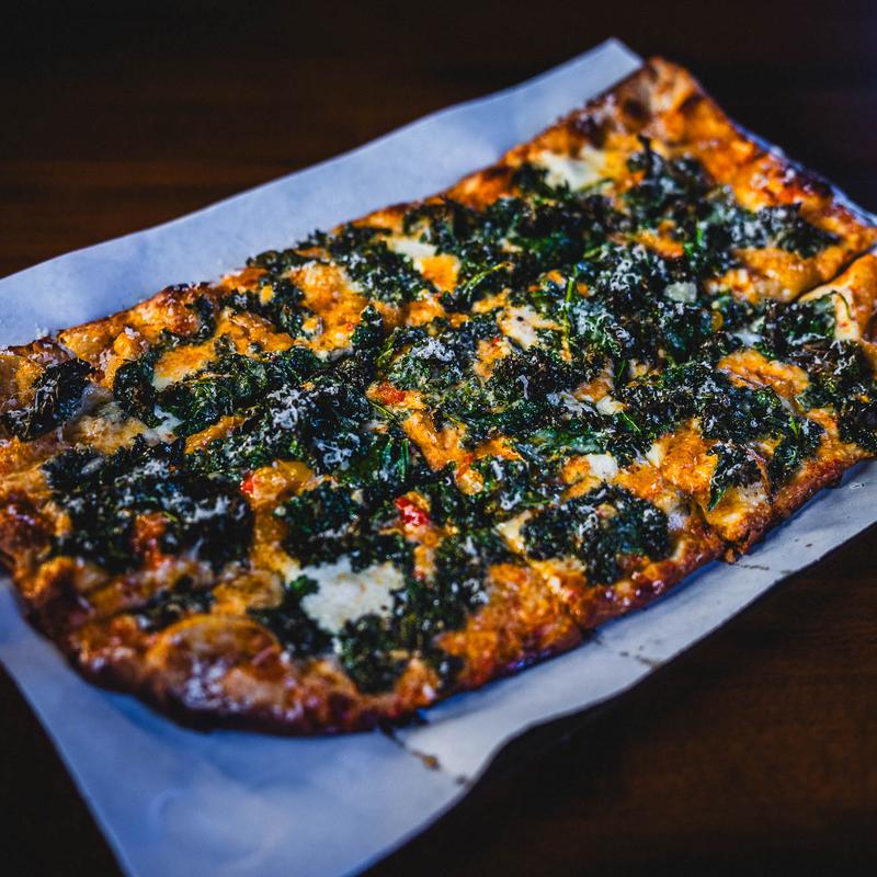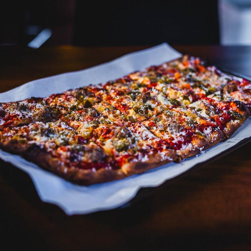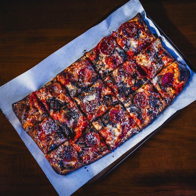 Tavern red sauce, beehive vegan pepperoni, vegan cheese.