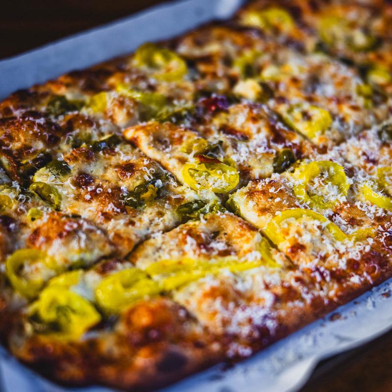 Garlic cream white Salice, spicy cherry peppers, mozzarella, Romano.